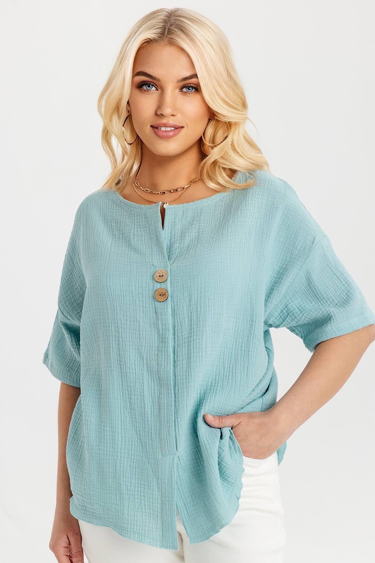 Описание: Стильная блузка свободного силуэта из 100% хлопка - муслина. Круглый вырез, спущенный рукав, декоративный лемент - пуговица. Ткань легкая, приятная к телу, не мнется. Блузка имеет свободный крой, идеально в жаркое время года, для путешествия и поездок. Летняя блузка подойдет как в офис, в школу, на деловую встречу, так и на прогулку и для повседневной носки. Блузка универсальная, подходит всем девушкам высокого и невысокого роста. Ткань не меняет цвет. Идеальная посадка на любую фигуру. Стирка при 30 градусов, усадка 5%.
